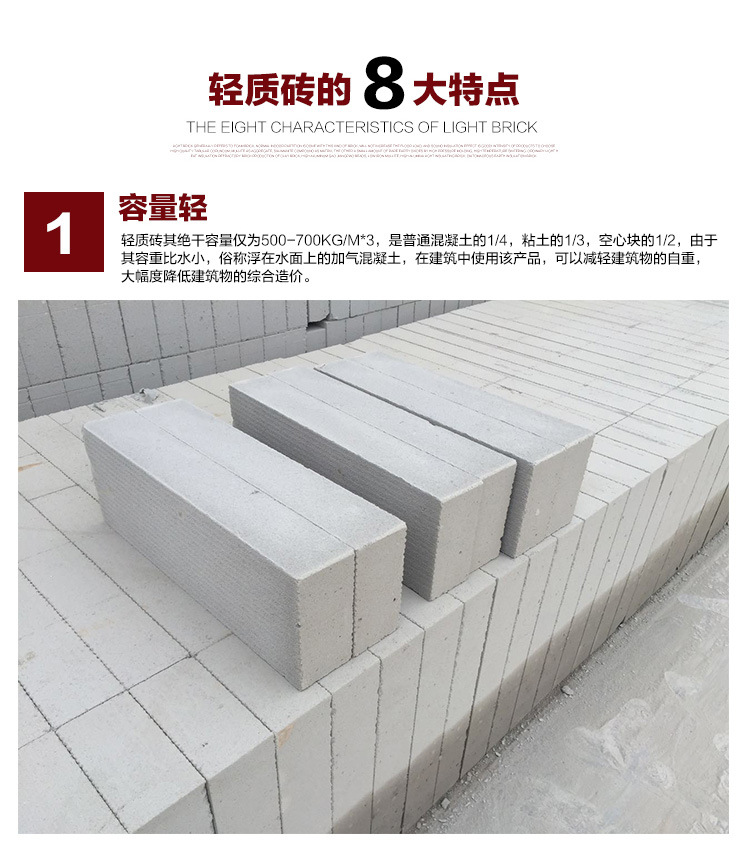 容量輕:輕質(zhì)磚其絕干容量?jī)H為500-700Kg/m*3,是普通混凝土的1/4,粘土的1/3,空心塊的1/2,由于其容重比水小,俗稱浮在水面上的加氣混凝土,在建筑中使用該產(chǎn)品,可以減輕建筑物的自重,大幅度降低建筑物的綜合造價(jià)。