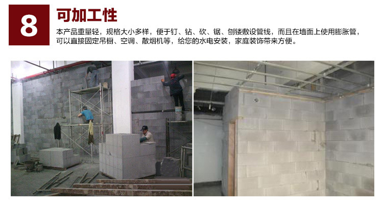 可加工性:本產(chǎn)品重量輕,規(guī)格大小多樣,便于釘、鉆、砍、鋸、刨鏤敷設(shè)管線,而且在墻面上使用膨脹管,可以直接固定吊櫥、空調(diào)、汕煙機(jī)等,給您的水電安裝,家庭裝飾帶來(lái)方便。