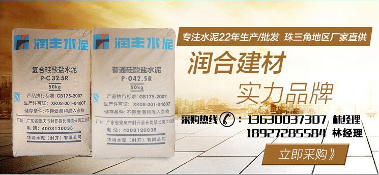 佛山市潤合建材公司 簡稱:廣東潤合。專注水泥22年生產/批發。主營:PC32.5R、PO42.5R、P1142.5R、PO52.5R華潤水泥、三虎水泥、海螺水泥、飛鹿水泥、路路通水泥、長力水泥。及C20、C25、C30、C35、C40、等C60以下混凝土。各大水泥品牌,在水泥采購商中享有較高的品質認可,廣東潤合與多家世界500強企業中鐵、中交、中國建筑和知名房企保利地產、碧桂園地產、龍光地產、美的地產長期合作。各品牌水泥有較大價格優勢,及水泥運輸配送優勢。佛山潤合水泥建材公司,將以薄利多銷及全心全意服務每位客戶。